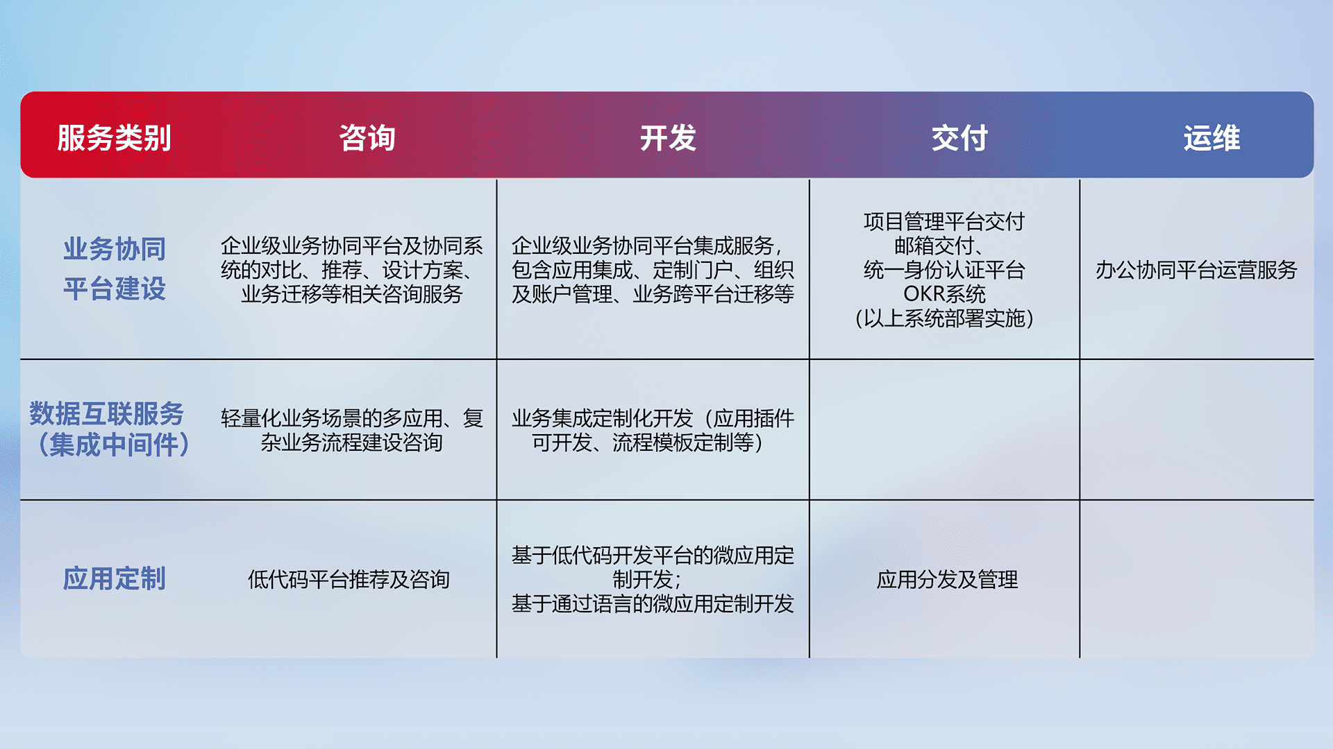 针对钉钉、、、、企微、、、IDaas等平台级产品提供产品的规划、、方案、、、交付、、、定制化开发等服务,,,实现如统一协同办公、、智能客户服务、、混合会议管理、、、智能数据查询、、等业务场景,,实现数字化转型。。。。